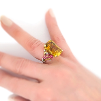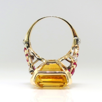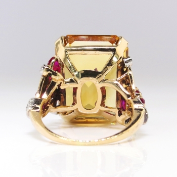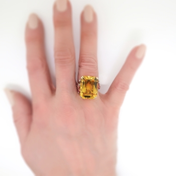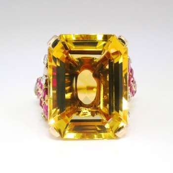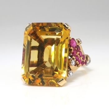 This big and sparkling cocktail ring from the 1940's will go with just about anything with it's golden cognac honey natural citrine, rich natural red rubies and sprinkling of bright and white single cut diamonds! It's one of my favorite Retro rings to date! The central emerald cut citrine weighs an impressive 21.01cts approximately (19.79mm x 15.19mm x 9.73mm) and has VVS clarity and good cut. In additional to that glowing gemstone are 18 bead set natural rubies weighing a total of approximately 3.24ct t.w. and 12 single cut diamonds that have an accumulative diamond weight of .18ctw and they range from H color, VS2-SI1 clarity. This ring has an approximate grand total gemstone and diamond weight being 24.43ct t.w.. This ring measures 19.84mm North to South, 22.45mm East to West, and is raised regally 10.13mm off the finger. This ring weighs a whopping 9.5 grams and is made in gorgeous 14k rose gold with platinum accents (tested and guaranteed). This miraculous ring is currently a size 6 and my trusted jeweler can safely re-size this up two sizes free of charge and will take an additional 1-5 business days, just ask (additional sizes up will be a flat $45.00 gold fee, please inquire). I will be more than happy to email a certified retail replacement appraisal upon completion of sale, just ask! Questions are welcomed on Ring-1849.