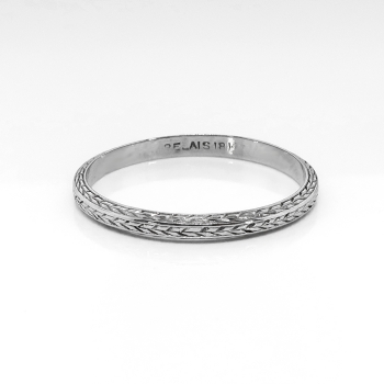 This special wedding band is Circa 1930's (A true Art Deco era wedding band!) and was created by world-renowned vintage US originated jewelry designer 'Belais'. It is a rare finger size of 8.25 and cannot be re-sized. Cinderella where are you?! This wedding band will stand out from the others, with it's original and crisp hand engraving and raised chase work. This ring weighs 1.7 grams, is made entirely in 18k white gold (stamped BELAIS 18K) and is an eternity style in a size 8.25. It is an ever so delicate 2.03mm wide, 1.27mm tall, and will look perfect with that vintage engagement ring or stacked with other bands! Questions are welcomed on Ring-1896.
